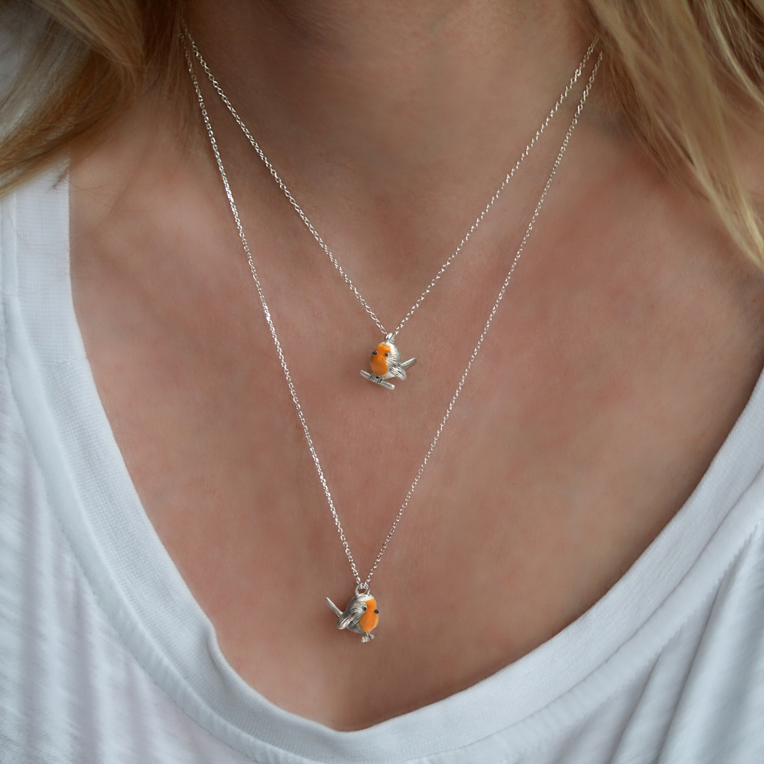 3D Rotkehlchen Kette: 925 Sterling Silber & orangene Emaille