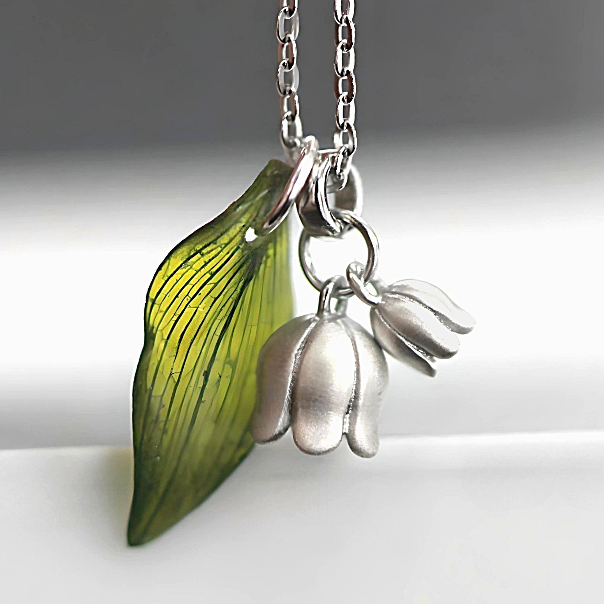 925 Maiglöckchen Kette mit echtem Maiglöckchenblatt in Harz