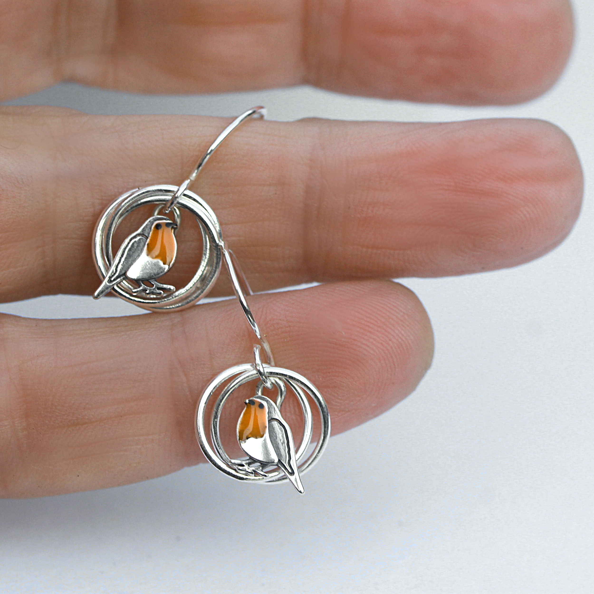 Delicate handmade earrings featuring a robin bird with orange enamel chest, set in 925 sterling silver. The bird sits inside three intertwined circles, symbolizing a bird’s nest in an abstract way. An original registered design, crafted with great attention to detail.