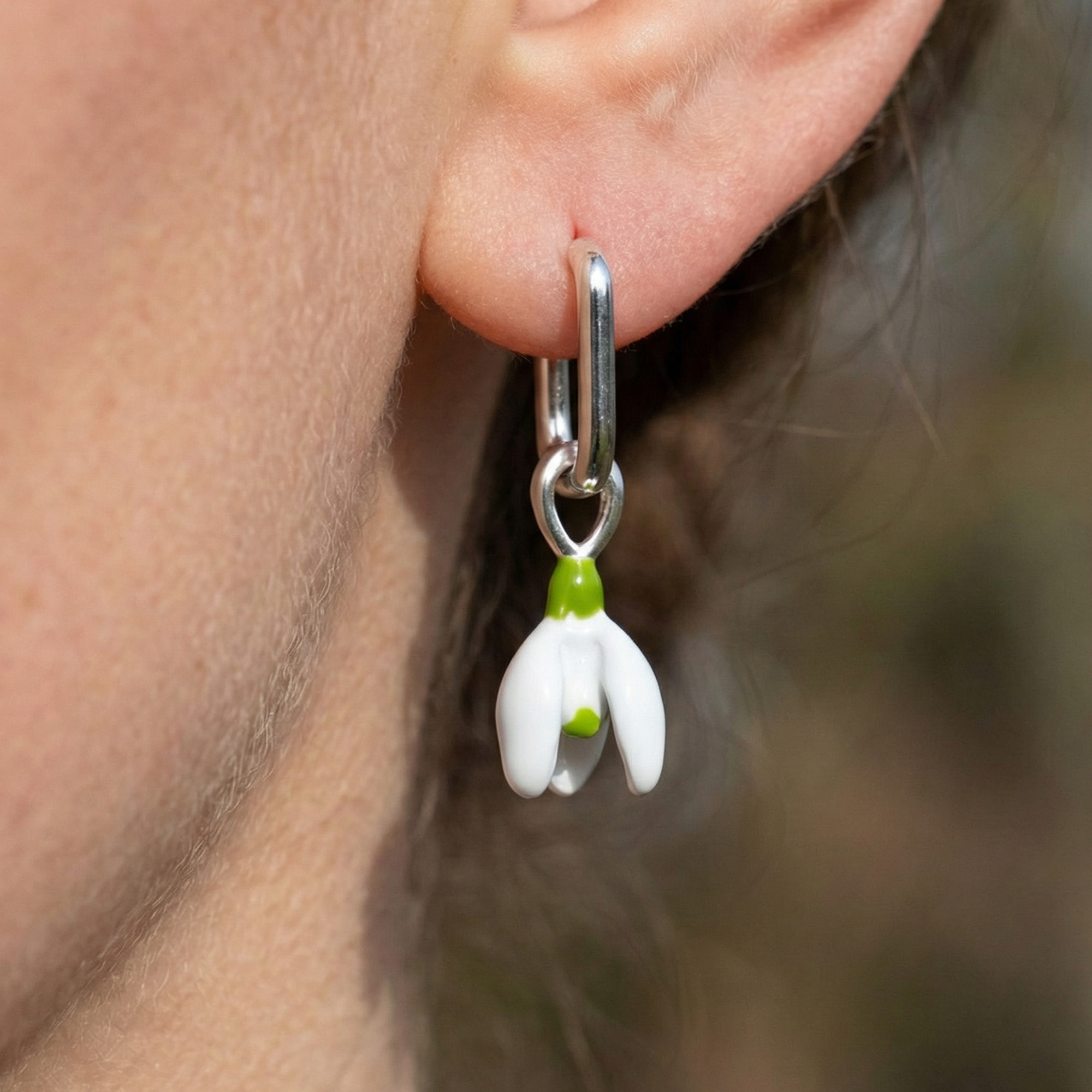 A detail I particularly like: the snowdrops are completely detachable. When opening the hoop, the flower charms can simply be removed. The earrings can therefore be worn in different ways — either as simple hoops or with the snowdrop flowers attached.