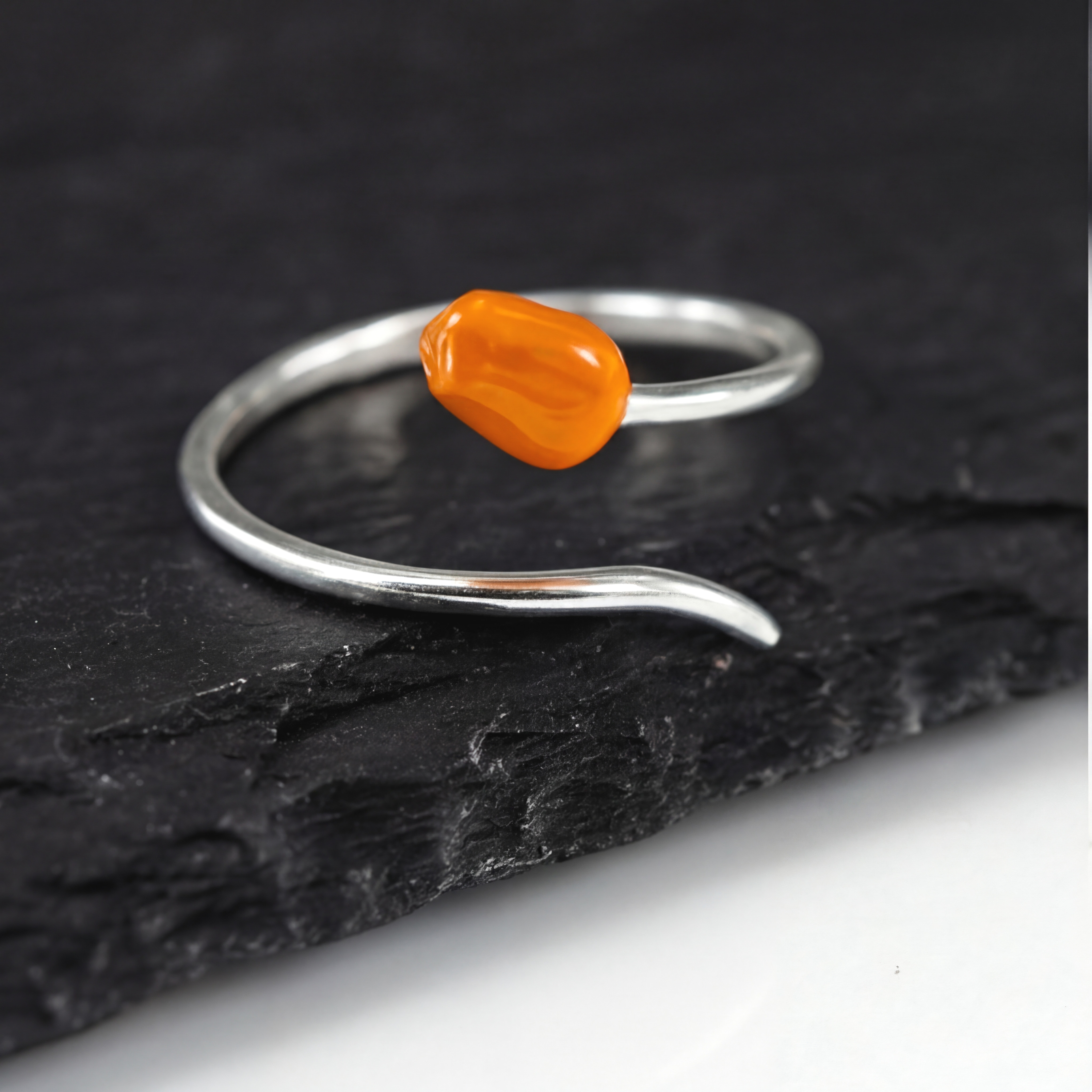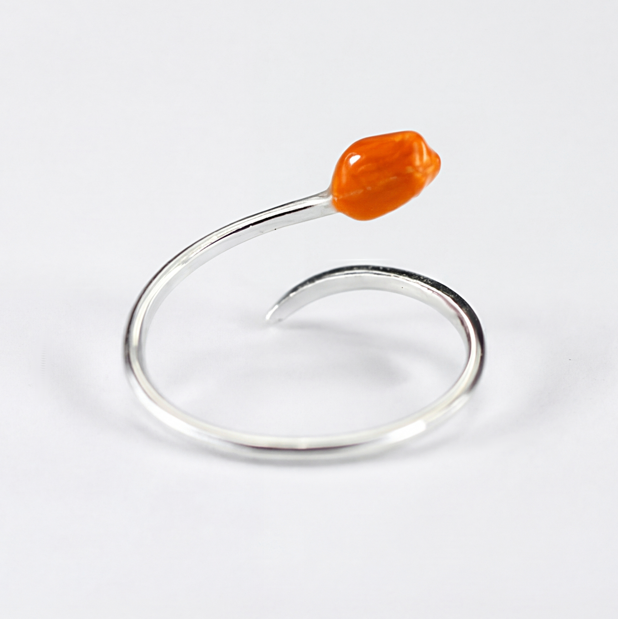 Dieser offene Ring aus 925 Sterling Silber hat an einem Ende eine orangefarbene Emaille-Tulpe und am anderen eine weich geschwungene Silberlinie. Dadurch entsteht eine leichte, moderne Wickelform, die schlicht wirkt, aber trotzdem auffällt.