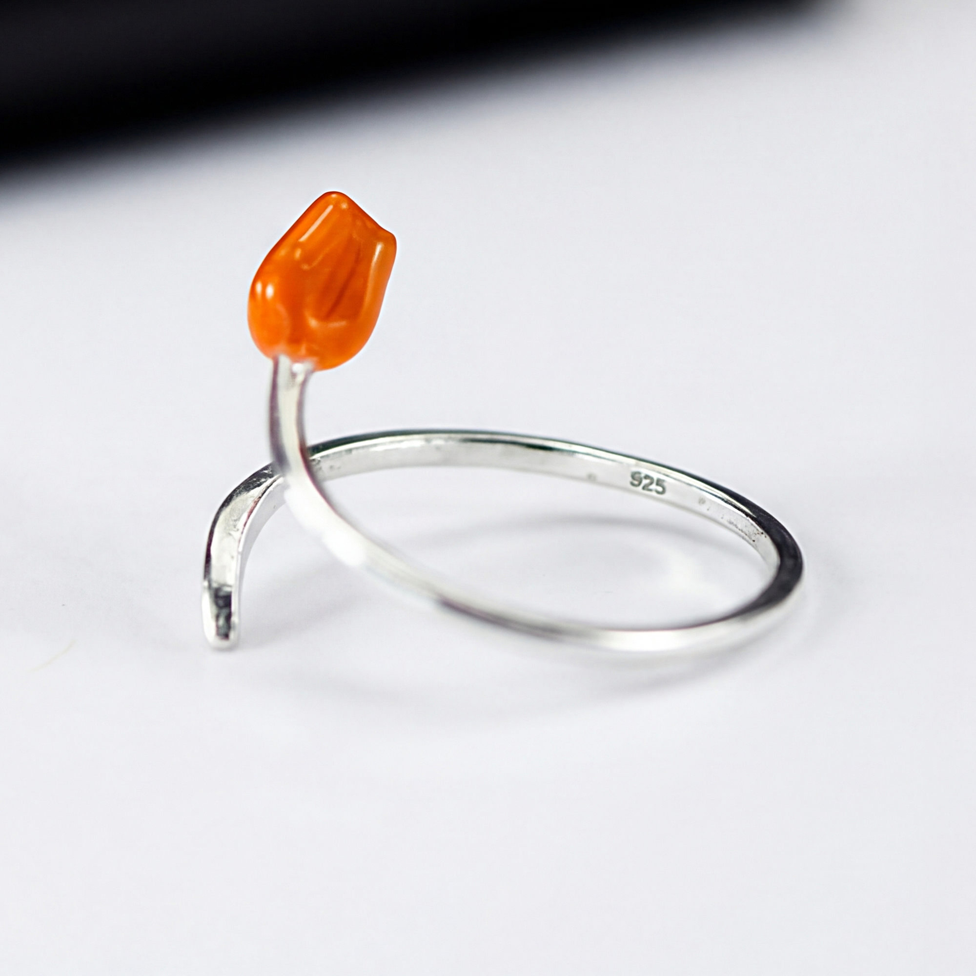 Tulpenring aus 925 Silber, verstellbarer Ring mit orangefarbener Emaille-Tulpe